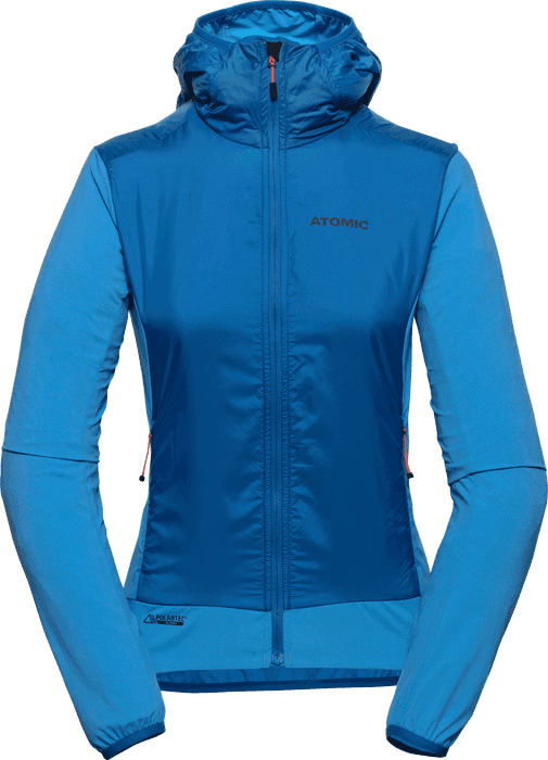 La felpa con cappuccio Atomic Backland Polartec® Alpha Hoodie W è uno strato intermedio leggero e isolante che regola il calore ed è comunque sufficientemente traspirante da poter essere indossata anche in salita.